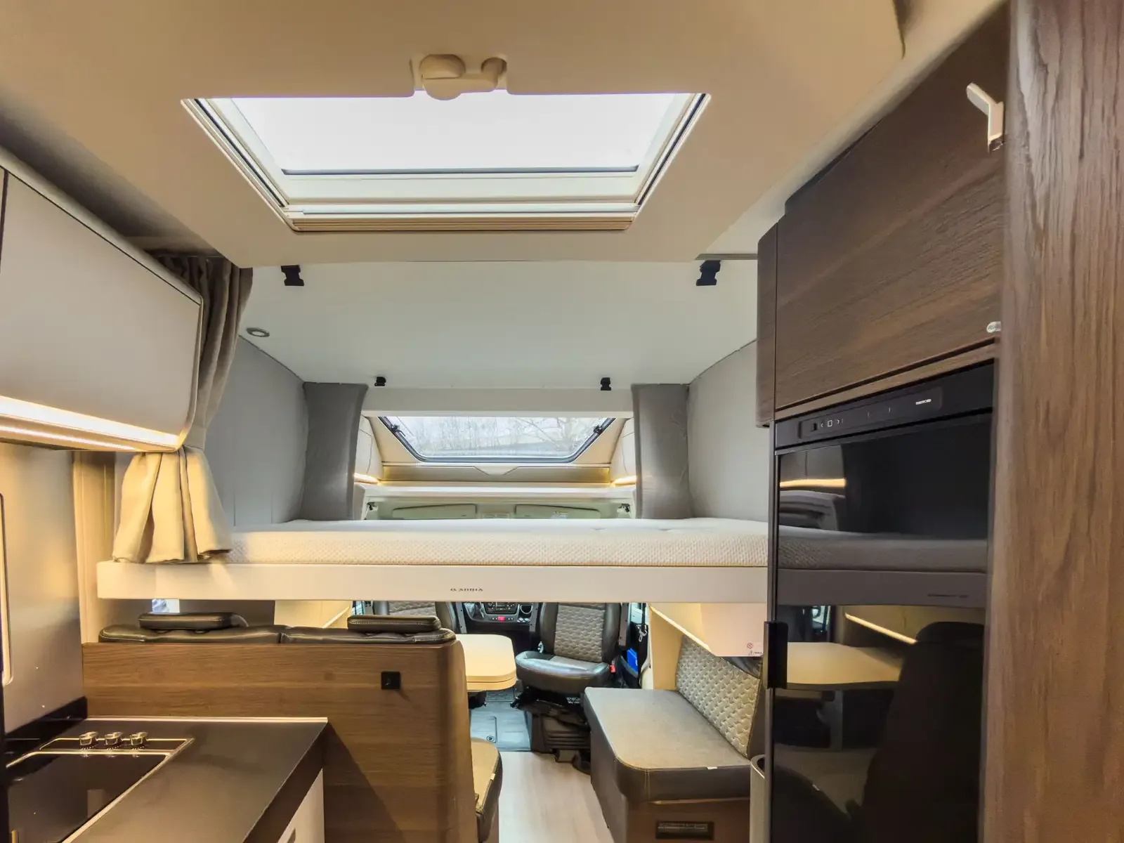 Kapacita lůžek: Zadní postele (205x80; 203x80 cm) + el. spouštěcí postel (200x125 cm).