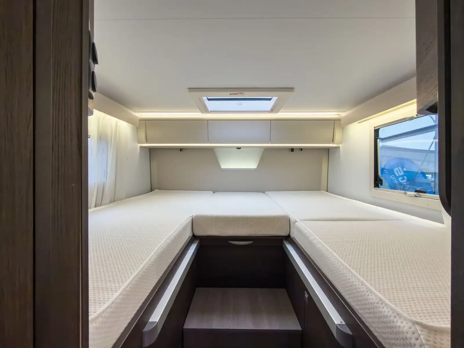 Variabilita: Pohodlné spaní pro 4-5 osob díky zadním podélným lůžkům a elektrické spouštěcí posteli v přední části.