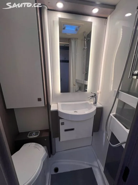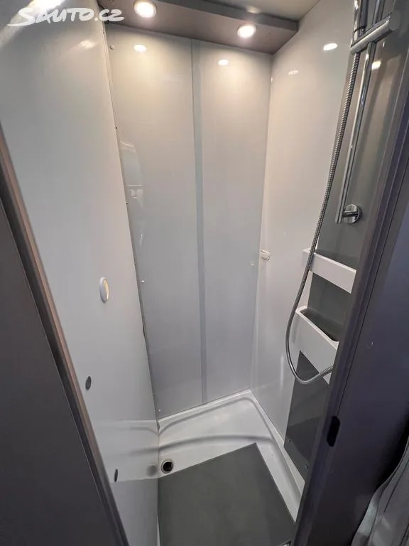 Kuchyně a hygiena: Velká lednice s mrazákem, plynový vařič se 3 hořáky, chytrá koupelna s otočnou zástěnou (WC + sprcha v jednom flexibilním prostoru).